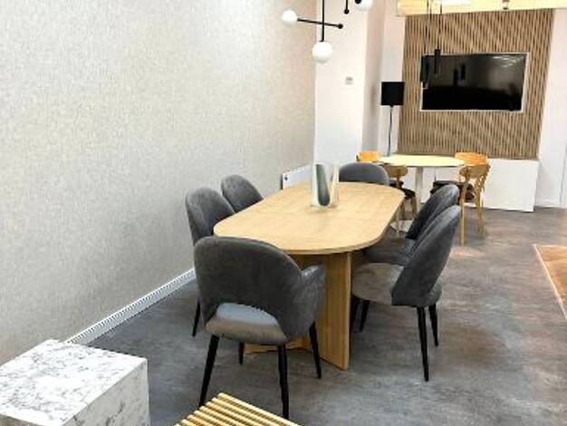 - Küche: Küchenzeile inklusive Waschbecken, Herd/Ofen, hohes Küchenregal, niedriges Regal mit zwei Fächern und Regalbretter - Wohnbereich: großer Ess-/Schreibtisch inklusive zwei Klappstühlen, Kommode mit drei Schubladen,Kleiderschrank mit Spiegel, Bücherregalbretter - Bad: Waschmaschine, Spiegelschrank, Waschbeckenunterschrank