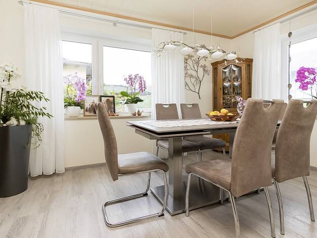 Das großzügige Haus mit dem schönen Satteldach überzeugt mit viel Platz und einem variablen Grundriss. Das Wohnzimmer schenkt genügend Raum zur Erholung, die sich anfügende Essecke wird schnell zum g...