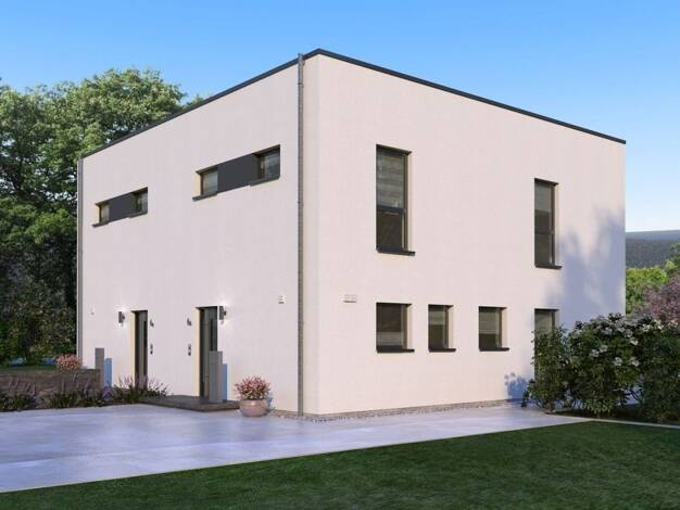 Die geradlinige Struktur der zweigeschossigen Flachdachvilla wird durch die Fassadenrücksprünge und die asymmetrische Gestaltung architektonisch ergänzt. Clever und vor allem für kleine Grundstücke g...