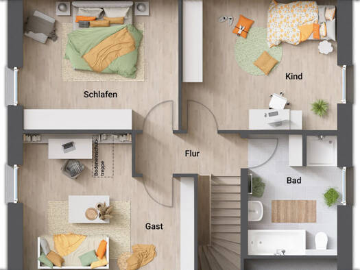 Wohnen33.65 m² Küche11.9 m² Schlafen15.96 m² Kind12.86 m² Arbeiten4.49 m² Bad10.16 m² Diele7.84 m² Windfang4.78 m² Hausanschlussraum6.18 m² Geschoss-Wohnfläche101.64 m² Geschoss-Nutzfläche6.18 m²