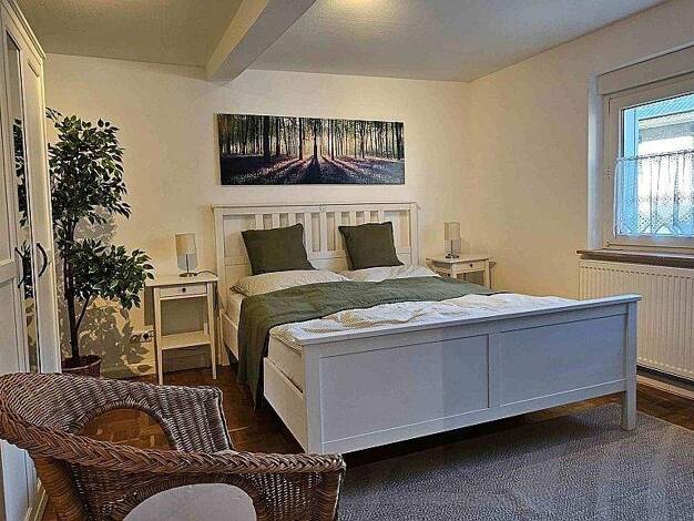 Möblierte 2-Zimmerwohnung in Neubrunn bei Würzburg. Die ca. 61m² große Wohnung, welche mit Laminatboden ausgelegt ist, befindet sich im Hochparterre eines Zweifamilienhauses. Die Einbauküche ist mit einem Herd, Backofen, Spülmaschine, Mikrowelle, Kühlschrank mit Gefrierfach, Kaffeemaschine, Toaster, Wasserkocher und sämtlichen Küchenutensilien ausgestattet. Hier ist ein Esstisch für vier Personen vorhanden. Die Möblierung im Wohnbereich besteht aus einem Sofa mit Couchtisch, Regal, Schrank und ...