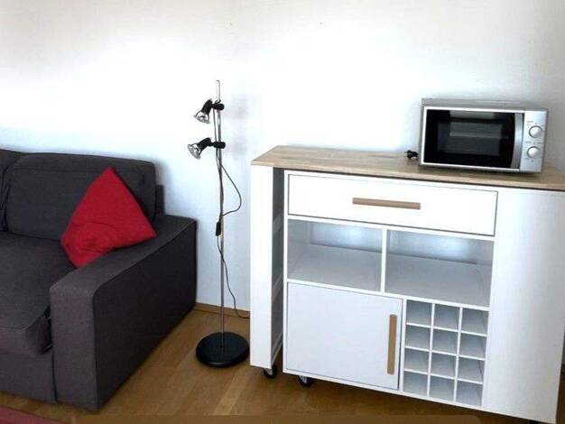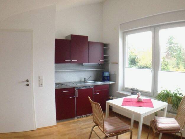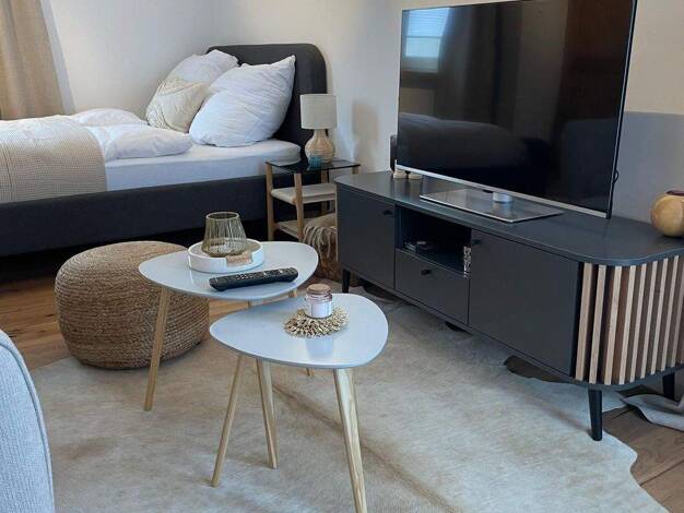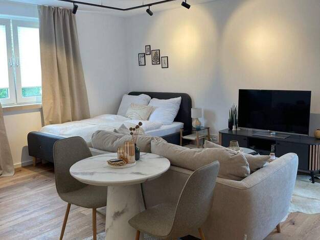Modernes, vollmöbliertes Apartment, Wohnfläche ca. 35qm, separater Zugang, 1. Obergeschoss, bestehend aus Flur mit Einbauschrank, Tageslichtwannenbad mit Waschtrockner, Wohn- Schlafraum mit Pantry-Kü...