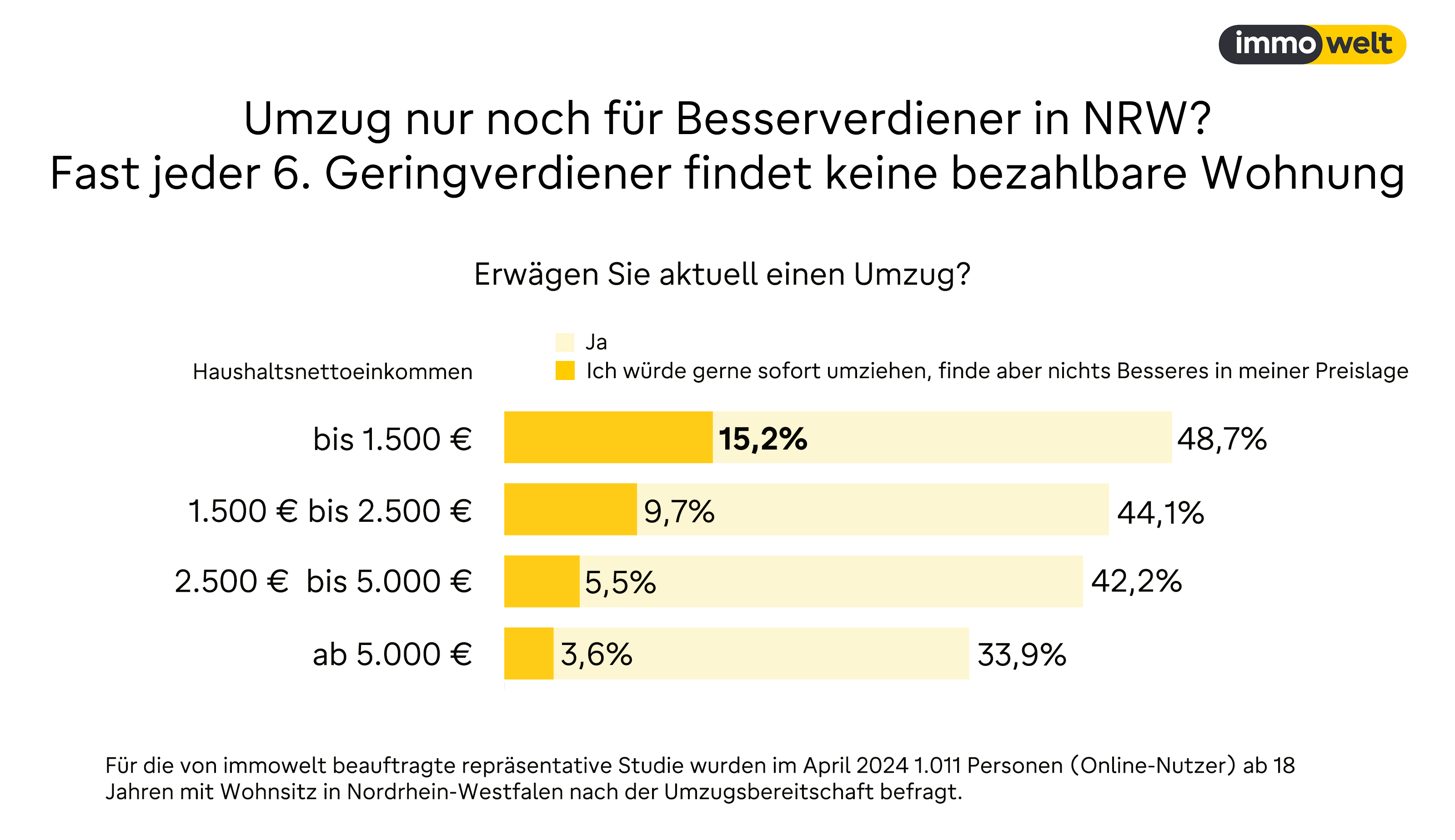 - Der Wille ist da, das Geld nicht: Knapp die Hälfte der Befragten mit geringem Einkommen will umziehen, fast jeder 6. findet aber nichts Besseres in der eigenen Preisklasse