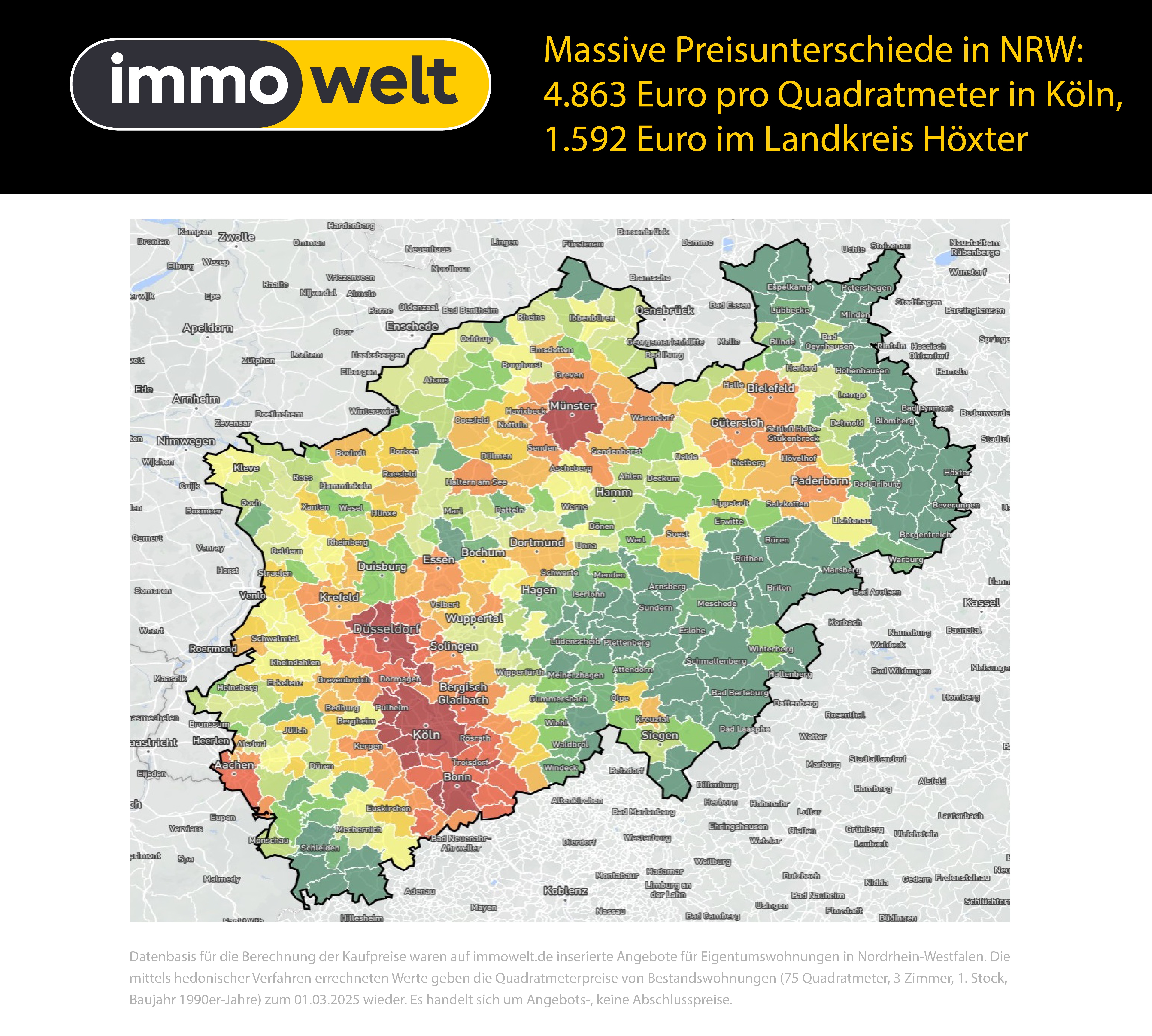 Datenbasis für die Berechnung der Kaufpreise waren auf immowelt.de inserierte Angebote für Eigentumswohnungen in Nordrhein-Westfalen. Die mittels hedonischer Verfahren errechneten Werte geben die Quadratmeterpreise von Bestandswohnungen (75 Quadratmeter, 3 Zimmer, 1. Stock, Baujahr 1990er-Jahre) zum 01.03.2020, 01.03.2022 und dem 01.03.2025 wieder. Es handelt sich um Angebots-, keine Abschlusspreise.