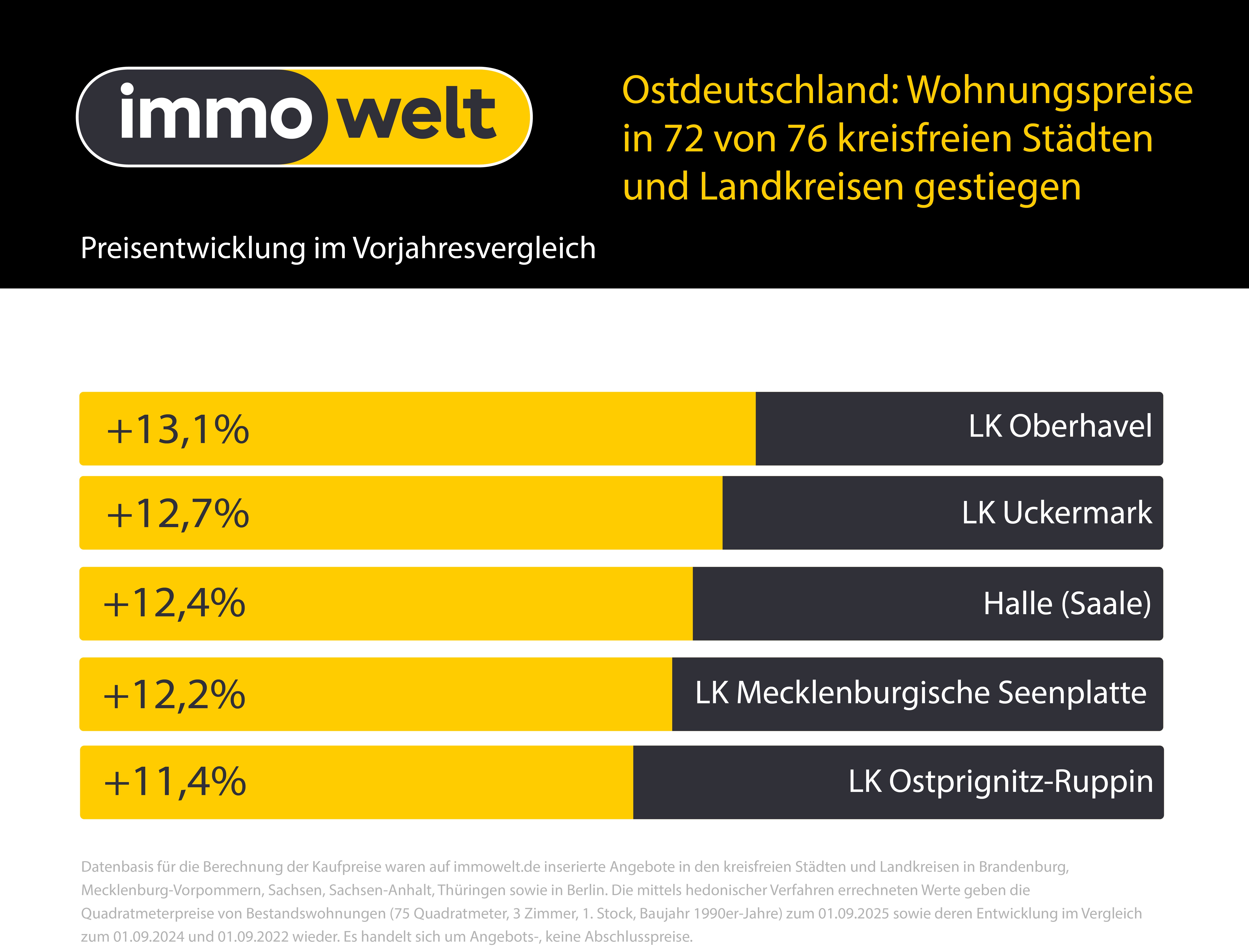Datenbasis für die Berechnung der Kaufpreise waren auf immowelt.de inserierte Angebote in den kreisfreien Städten und Landkreisen in Brandenburg, Mecklenburg-Vorpommern, Sachsen, Sachsen-Anhalt, Thüringen sowie in Berlin. Die mittels hedonischer Verfahren errechneten Werte geben die Quadratmeterpreise von Bestandswohnungen (75 Quadratmeter, 3 Zimmer, 1. Stock, Baujahr 1990er-Jahre) zum 01.09.2025 sowie deren Entwicklung im Vergleich zum 01.09.2024 und 01.09.2022 wieder. Es handelt sich um Angebots-, keine Abschlusspreise.